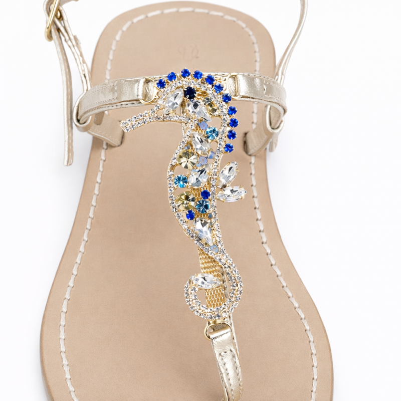 The Capri-style jewel sandals with blue Swarovski crystals represent the perfect blend of elegance, craftsmanship, and Mediterranean style. Made from premium leather and high-quality natural hide, these sandals are entirely handmade, with great attention to detail, following the tradition of Italian artisanal craftsmanship.