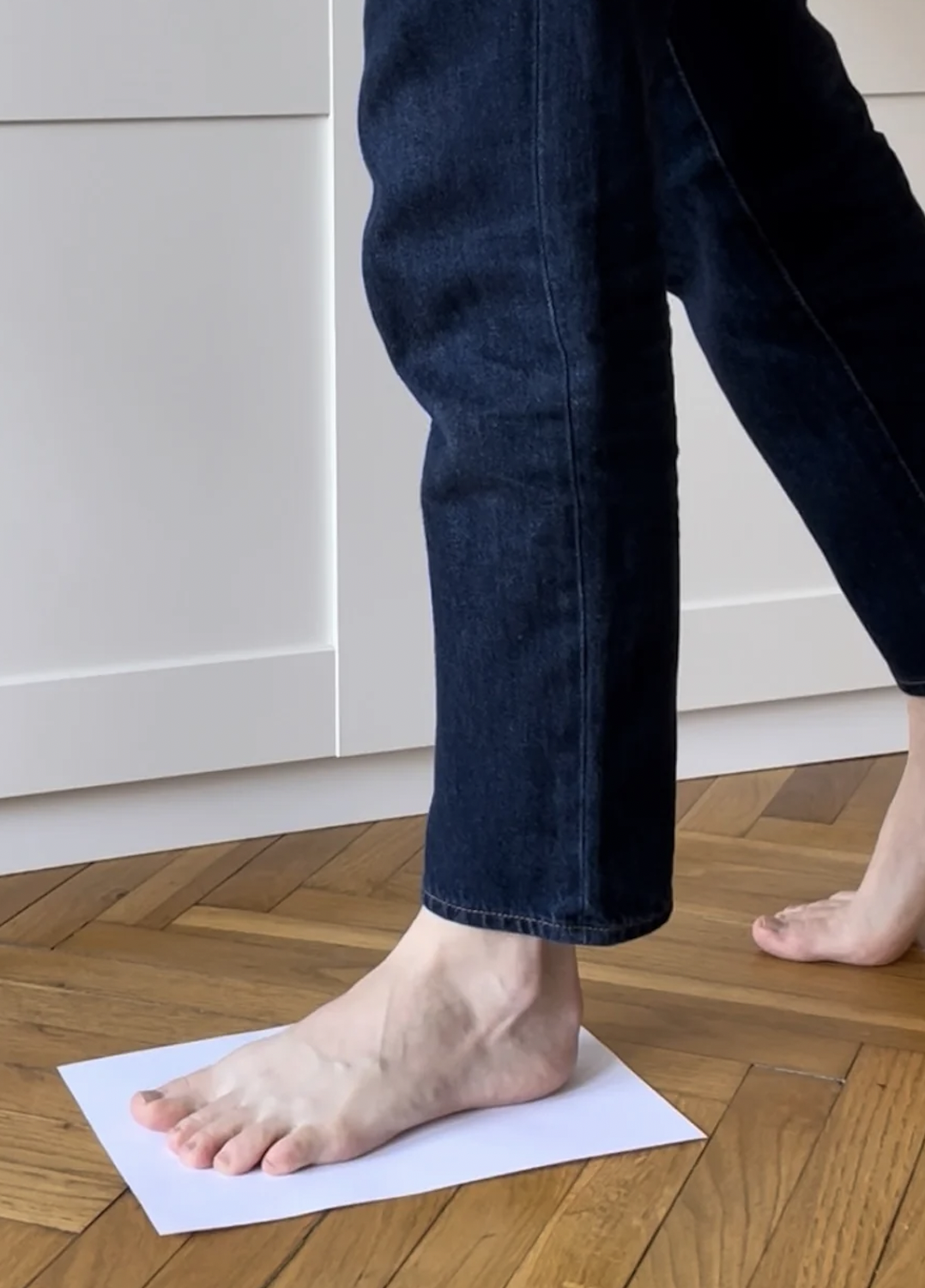 Stando in piedi appoggiare il piede nudo su un foglio di carta;